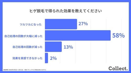 「ツルツルになった」27%、「自己処理の回数が大幅に減った」58%、「自己処理の回数が減った」13%、「効果を実感できなかった」2%。
