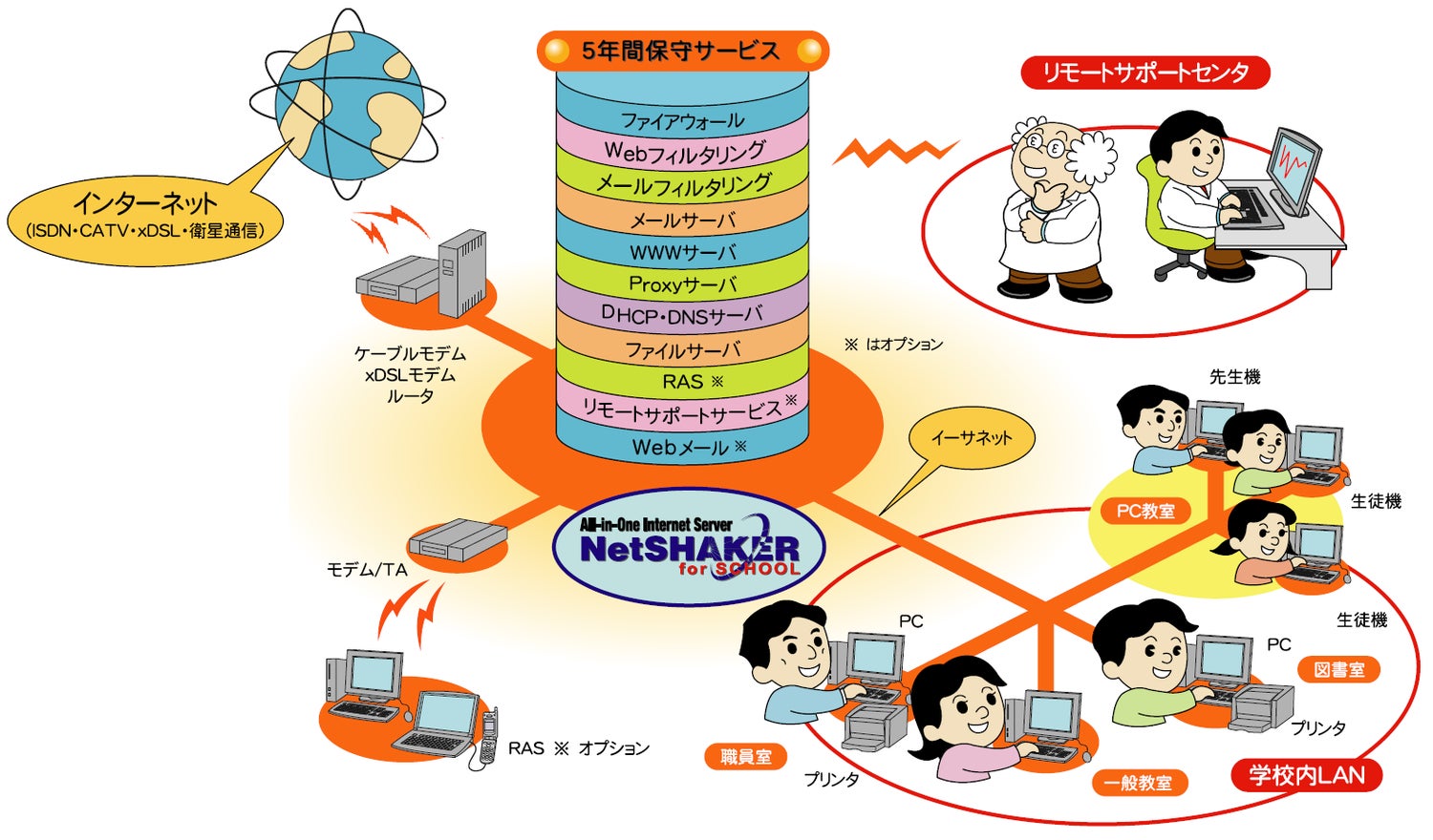 この頃、「NetSHAKER for School」と情報セキュリティメーカーが提供するサーバー版Webフィルタリングソフトを組み合わせた製品を提供しました。この製品は、パソコン教室の整備向けのセキュリティ製品として、学校のインターネット利用に際して不適切な情報の流入を防ぐためのものでした。