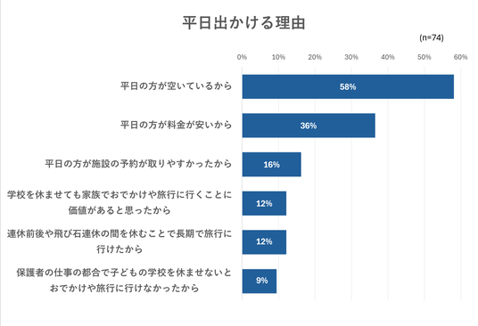 平日に出かけるという人に、その理由を尋ねました。最も多かったのは、「平日の方が空いているから」(58%)という回答でした。混雑を避けたいと考える人が多いことがわかります。