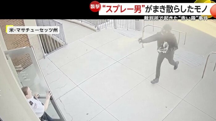 アメリカ・マサチューセッツ州の裁判所で、男が唐辛子スプレーを警察官に噴射する瞬間がカメラに捉えられた。ヘルメットにガスマスクという異様な姿で現れた男は、過去にも同様の騒動を起こしていて、この日も審問を受ける予定だったという。