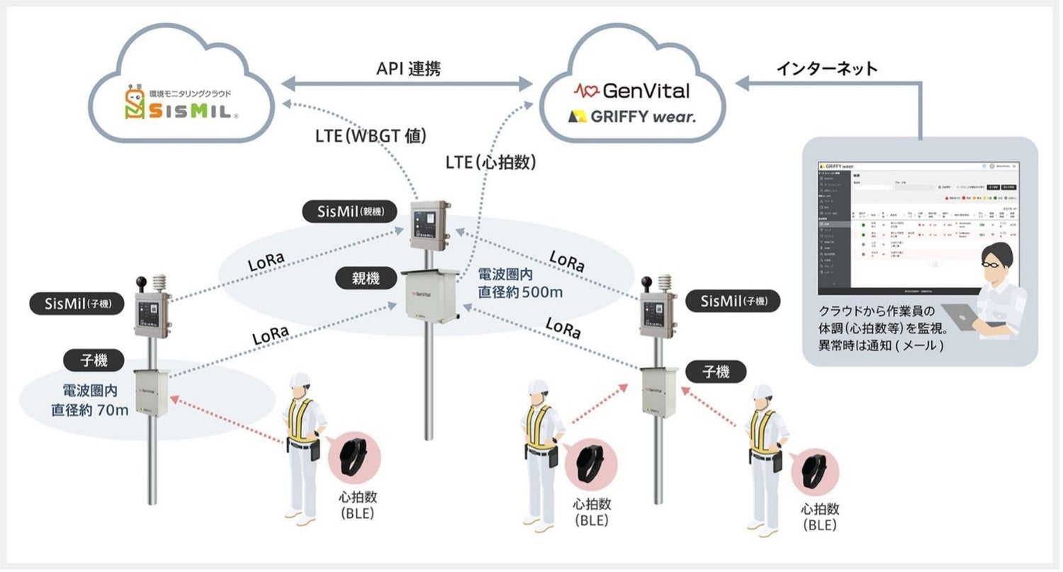 そして、その夏当社株式会社GRIFFY(以下「GRIFFY」)はその現場に体調管理ソリューション「GenVital(ゲンバイタル)」(以下「ゲンバイタル」)を提供しました。私たちが提供したのは、炎天下での作業者の熱中症対策に貢献する安全支援システム。作業者の心拍数と現場の暑さ指数(WBGT)の収集データを基に、現場作業員の体調をリアルタイムな情報をクラウドに集約し、異常を即時に通知し作業者を見守り続けました。