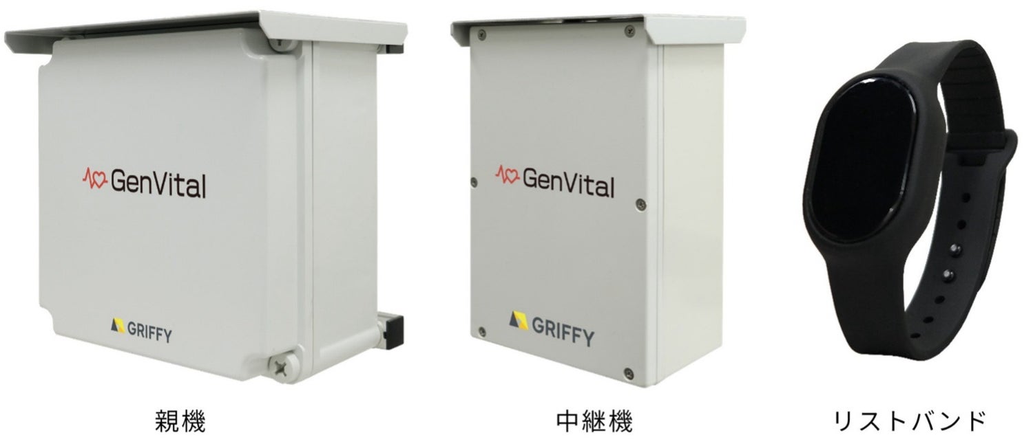 専用クラウドサーバ「GRIFFY Wear.」にLTE通信にてデータを送信する親機、心拍数データを収集する中継機、現場作業員が装着し心拍数を計測するリストバンド※から構成されます。リストバンドから中継機の通信はBLE、中継機から親機への通信はLoRaを使用し、暑さ指数計測およびデータ収集は、環境モニタリングクラウド「SisMil」※を使用します。