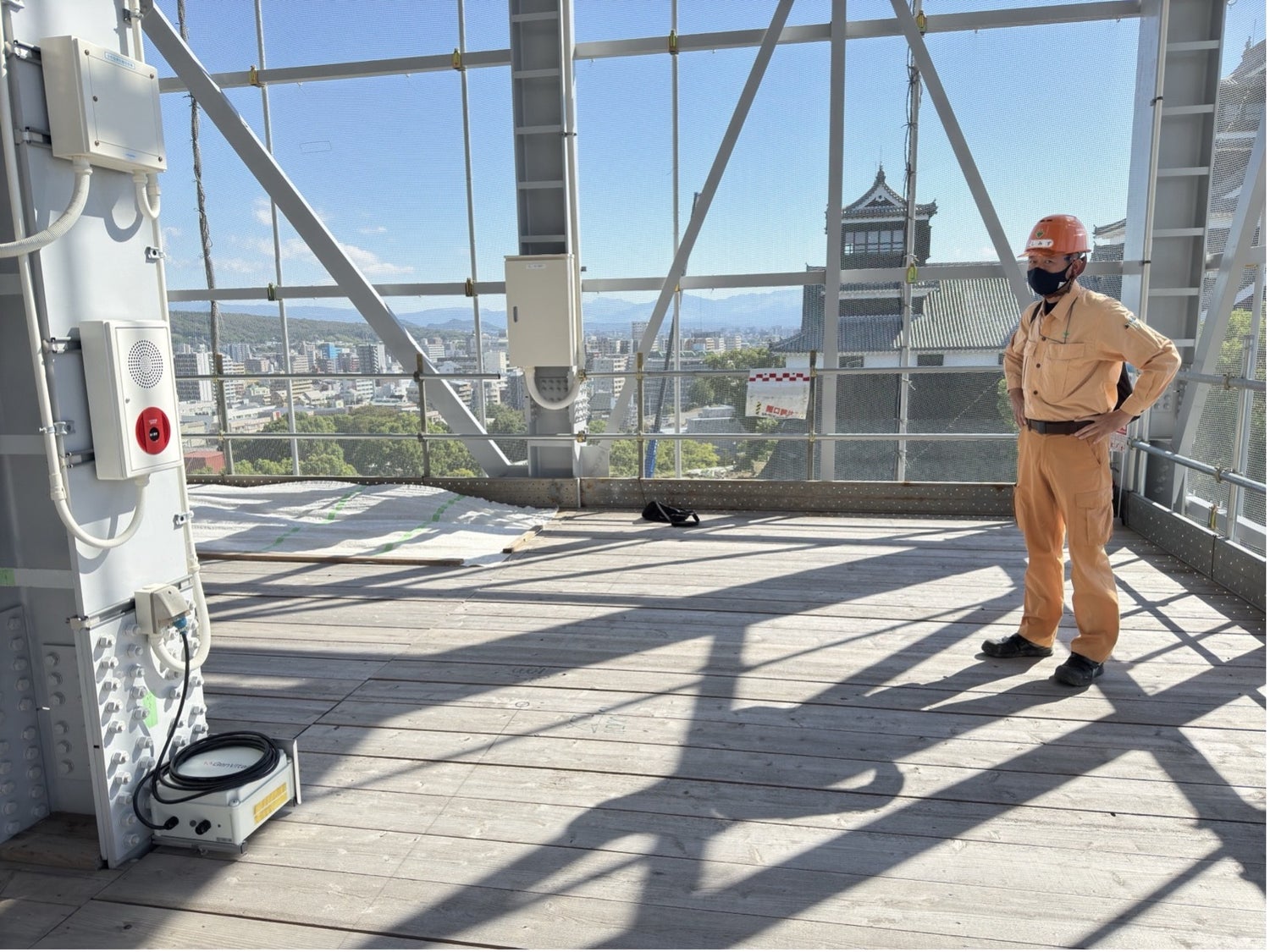 ここの最上部にゲンバイタルの親機が設置されていました。宇土櫓は天守閣の次に高い場所であり、まわりを一望できるため、こちらに親機を設置しているそうです。親機1台で熊本城すべてのエリアに電波は届いておりました。高い位置に親機を設置することにより子機へ届きやすくなります。