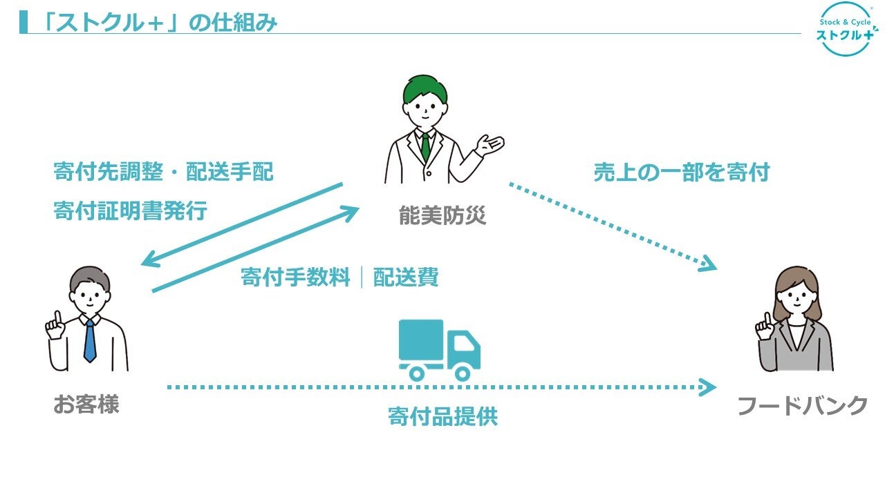 「ストクル+」は、災害備蓄品を寄付したい企業とNPO団体(フードバンク)を能美防災がマッチングすることで、備蓄品寄付による社会貢献と入替における業務効率化を両立するサービスです。これにより、企業は不要となった備蓄品を効率的に寄付し、社会貢献活動を推進しながら、廃棄コストや手間を削減することができます。