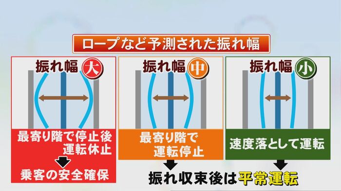 振れ幅が「小さい」予測の場合は、速度を落として運転を続け、振れが収束した時点で自動的に平常運転を再開するなど、個々の地震に合わせ、エレベーターを最適に稼働させる。
