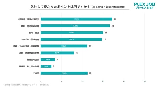 このように、施工管理・電気設備管理職における入社後の満足ポイントは、「待遇」や「キャリア形成」といった転職前に重視されていた要素よりも、「人間関係の良さ」や「働きやすさ」といった現場での実感に根ざした評価が目立つ結果となりました。