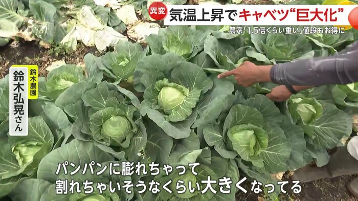 気温の高い日が続いたことで大きく育った“巨大キャベツ”。育てた鈴木さんもビックリの重さ。