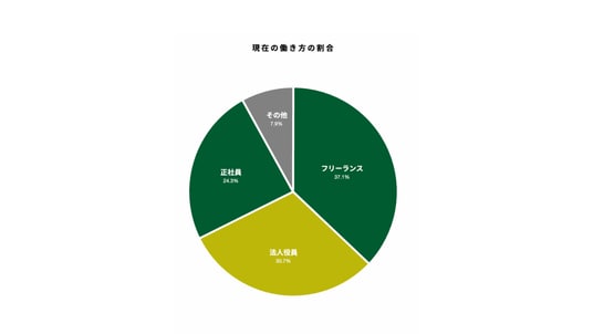「現在の働き方」に関する調査の結果、最も多くの回答者が選んだ働き方はフリーランスであり、全体の37.1%を占めました。次いで、法人役員という働き方が30.7%の回答を得ています。