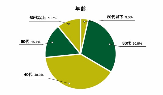 自治体複業に従事している人材で最も多いのは40代で40%、次いで30代が30%を占めています。