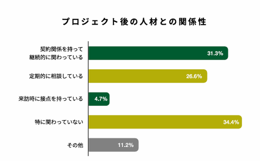 69.3%の複業人材が現地訪問を実施し、62.3%の自治体が人材と継続的な関わりを持っていることが分かりました。自治体が複業人材の活用を広げることで、関係人口・交流人口の増加にもつながる可能性が期待されます。