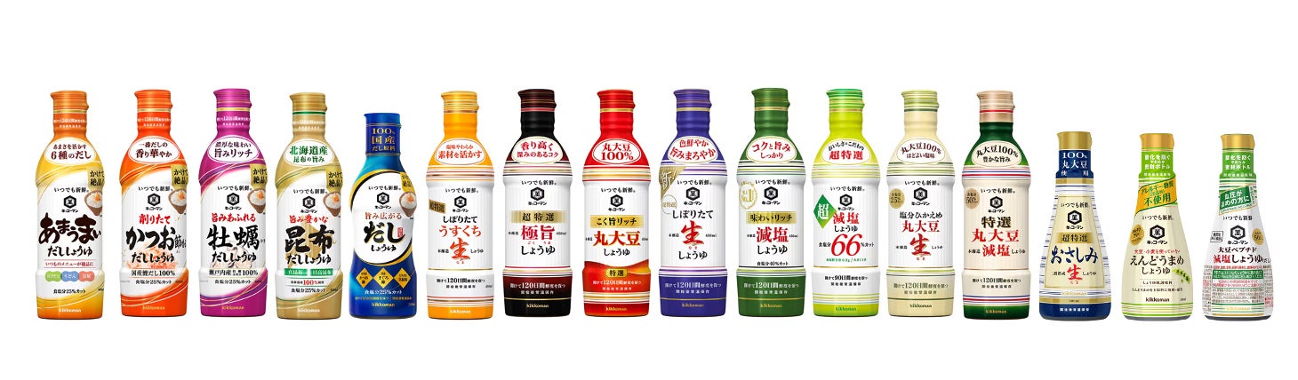 『いつでも新鮮』シリーズは現在、全16種(*3)のラインアップ。なかでも『しぼりたて生しょうゆ』と『味わいリッチ 減塩しょうゆ』は同シリーズの主力商品です。このほか、おさしみの味を引き立てる『おさしみ生しょうゆ』や、『旨み豊かな 昆布だししょうゆ』、『旨み広がる だししょうゆ』などもあります。
