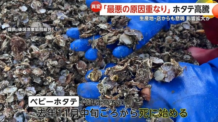 うずたかく積まれていたのは、ホタテの稚貝だ。去年の春に生まれ今年出荷される予定だったベビーホタテだったが、去年11月中旬頃から死に始めたという。