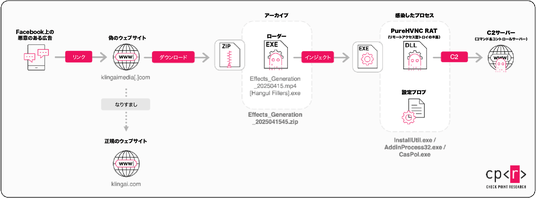 - 2025年初頭、CPRは、生成AIサービス「Kling AI」の人気を悪用したサイバー攻撃キャンペーンを確認しました。この攻撃は、ソーシャルメディア上の偽広告から始まり、ユーザーを騙して悪意のあるファイルをダウンロードさせるために設計された偽のウェブサイトへと誘導していました。