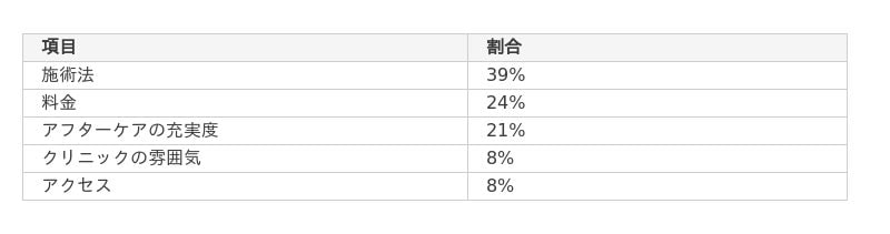 クリニックを選ぶ際に「施術法」を重視すると回答した方は、全体の39%にのぼりました。