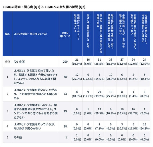 LLMOの認知・関心度 (Q1) × LLMOへの取り組み状況 (Q2)