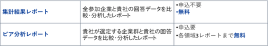 - 全参加企業や同業他社などの任意の企業群と比較し、自社の報酬水準やコーポレートガバナンス改革の実質化に向けた取組みの立ち位置の把握(参加および集計結果レポート、ピア分析レポート(3パターンまで)は無料)