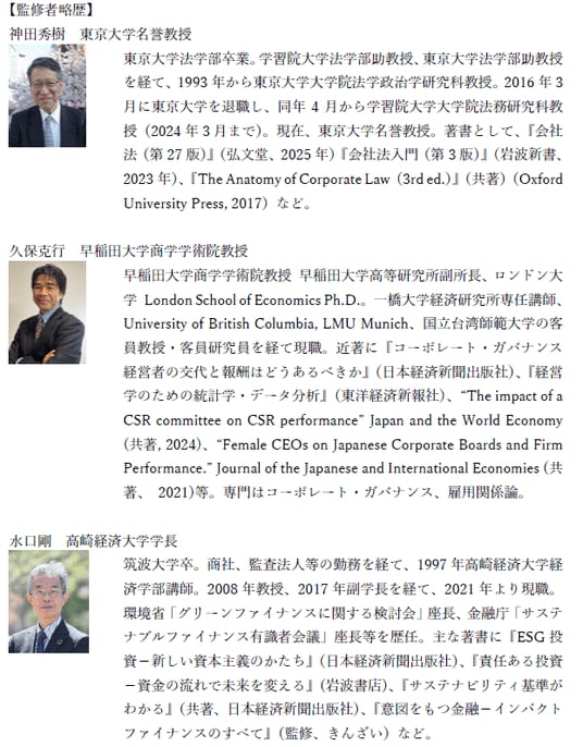 経済産業省のCG研究会において座長を務めた神田秀樹名誉教授にサーベイ全体を総監修いただくとともに、5領域それぞれの第一人者である神田秀樹教授、久保克行教授、水口剛学長の監修のもと、調査内容を刷新・拡充いたしました。