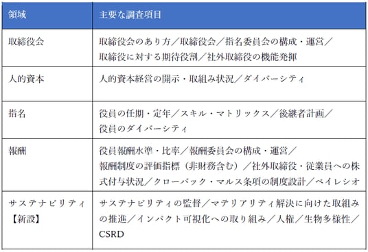 本サーベイは、CG強化の要諦となる取締役会・人的資本・指名・報酬・サステナビリティの各分野を本格的にカバーしております。「稼ぐ力」の強化に不可欠な5ガバナンス領域の統合的な取組みの深化にご活用いただけます。