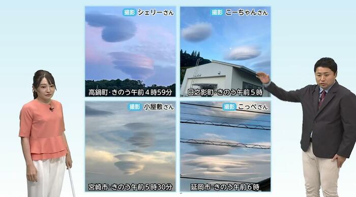 まずは視聴者から届いた写真をご紹介。15日午前5時30分、国富町で、まるで「UFO」のような雲を撮影したとのこと。