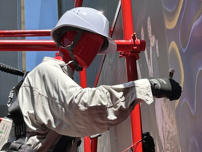 1970年の大阪万博では全身真っ赤だった作業人形は今回、リアルなベージュの作業服姿になり、命綱まで付けている。“未完”は現代にもつながっていたのである。