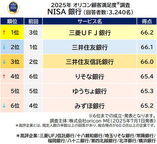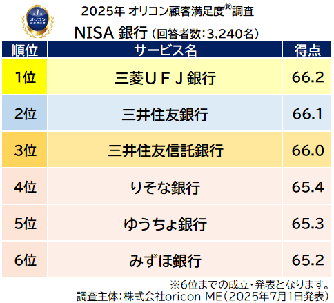 オリコン株式会社(本社:東京都港区 代表取締役社長:小池 恒、略称:オリコン)は、グループ会社である株式会社oricon MEが、実際のサービス利用者を対象に第三者の立場で実施した『NISA 証券会社/銀行』の顧客満足度調査の結果を、2025年7月1日(火)14時に「オリコン顧客満足度(R)」公式サイト内にて発表いたしました。ランキングの結果は下記の通りとなりました。