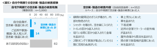 自宅で空き巣・強盗被害にあった人は5%、ご近所や家族など周囲の人が被害にあったと聞いた人は14%。具体的には、ガラスやシャッターが壊され侵入された、車、室外機、農具や米などが盗まれたという声が聞かれた。<図5>