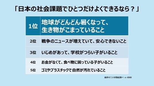 「日本の社会課題の中で、一つだけよくできるとしたら?」という問いに対し、最も関心が高かったのは「地球温暖化や環境の問題」、次いで「戦争の不安」、「いじめ」など、子どもたち自身が感じる不安や違和感に関わるものでした。「貧困」や「少子化」などの社会構造に関心を寄せる声もあり、社会課題を自分の生活に引き寄せて捉える姿が見られました。