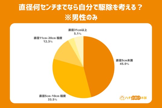 調査の中では男女の差が明確に表れました。男性回答は「直径5cm未満」と「直径5cm-10cm 程度」が全体の79.4%だったのに対して、女性回答は88.6%です。このことから、男性のほうが大きいサイズの駆除が可能と考えている事がわかります。