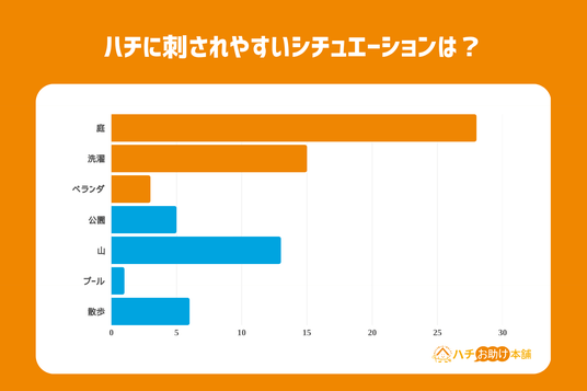 最後に、ハチに刺されやすい場面やシチュエーションに関しての調査です。ハチに刺されたシチュエーションに関するアンケートでは、様々な回答が得られましたが、回答の中で最も頻出した単語は「庭」となり、次いで「洗濯」というキーワードが回答に多く見受けられました。「山」に関連するイベントや場所での被害、「プール」など、いわゆる屋外アクティビティの被害よりも、自宅の敷地内に関する回答が多かったのは驚きです。