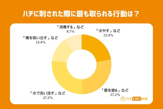 ハチに刺された際に最も取られる行動は「病院に行く」が最も多かったものの、冷やす方や薬を自身で塗るといった、個人での対処をする方も多い結果に。