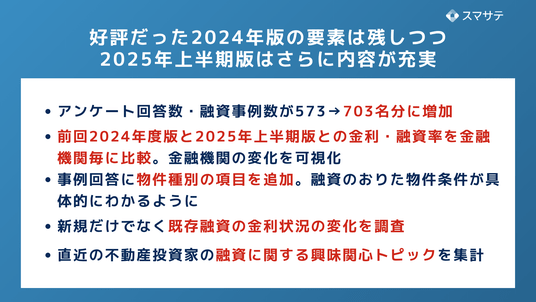 2025年現在、不動産投資を取り巻く環境は大きく変化しています。日本銀行の利上げによりローン金利が上昇し、都市部では不動産価格の上昇も継続。さらに物価高やトランプ関税といった外的要因も重なり、投資判断は一層複雑化しています。こうした中、金融機関の融資条件や動向は、投資戦略に直結する重要な情報となっています。スマサテでは、こうした情報の可視化を目的に、2024年末に不動産投資家573名を対象としたアンケートを実施し、「融資事例大全2024」を制作、その信頼性の高い分析と充実した内容が高く評価されました。この大きな反響を受け、さらなる情報の充実を図った「融資事例大全2025年上半期」を新たに制作、不動産投資家および不動産会社へも配布を開始しました。