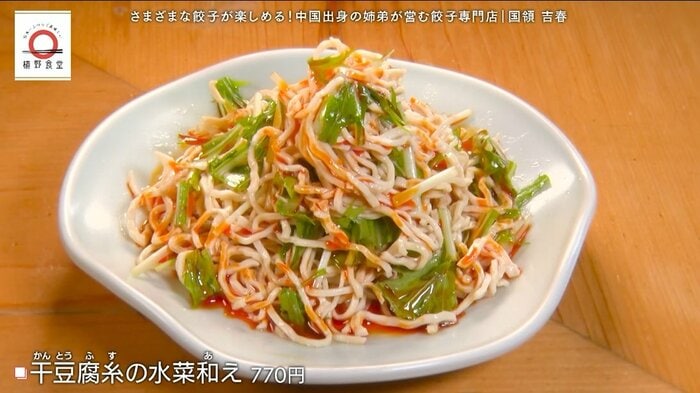 さらに、豆腐を圧縮して水分を抜き麺状にした「干豆腐糸の水菜和え」や、自家製のピリ辛だれがかかった「よだれ鶏」など、餃子を待っている間も楽しめる前菜や副菜も充実。訪れるたびに餃子の新たな魅力に出会える店だ。
