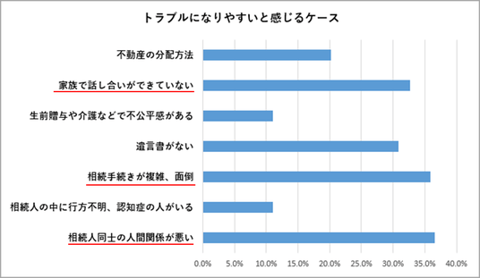 ・トラブルになりやすい原因のトップは「人間関係の悪化」で、「手続きの複雑さ」「話し合いの欠如」がそれに続きます。