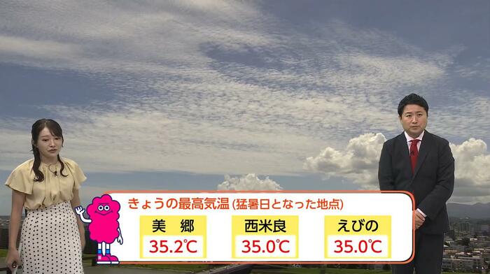 13日の宮崎県内は日差しがギラギラと照り付け気温が上がった。日中の最高気温は美郷で35.2℃、西米良とえびので35.0℃と、猛暑日となったところがあった。真夏の平年値が32℃前後なので、真夏以上の暑さとなったが、空を見上げると「秋の気配」も感じられる。