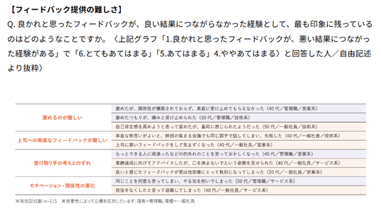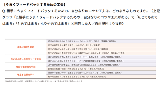 ⇒このような経験が、以後のフィードバックの「提供」をためらわせることも理解できるが、一方で、それらの経験を通じて学び「相手に応じた対応」「良い点と悪い点のセット提示」「理由や改善策を明示」「敬意と信頼を示す」など、具体的な工夫をしている人も多い(管理職 48.0%、一般社員35.9%が該当)。状況や相手により正解のないフィードバックだが、知見や経験をもつことで積極的な「提供」が可能になると考えられる。