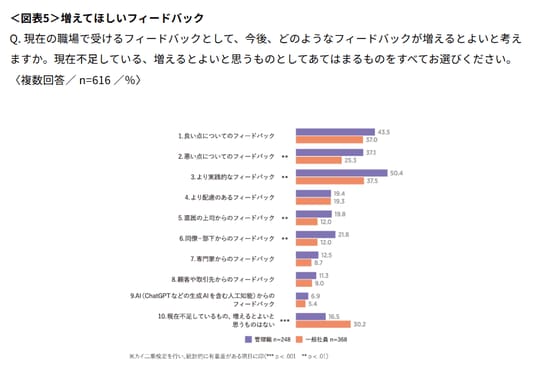 - 今後増えてほしいフィードバックとしては「より実践的なフィードバック」が最多。特に管理職は5割を超える結果に(図表5)