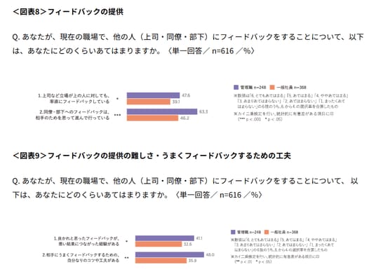 - 一方で上司が「悪い点についてのフィードバックをくれる」とした回答は、管理職が59.7%、一般社員が56.0%であったのに対し、同僚-部下が「悪い点についてのフィードバックをくれる」とした回答は、管理職が47.2%、一般社員が43.8%に留まり、「同僚-部下から」が「上司から」より有意に低い傾向が確認された。