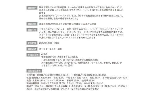 企業における経営・人事課題の解決および、事業・戦略の推進を支援する株式会社リクルートマネジメントソリューションズ(本社:東京都港区 代表取締役社長:山崎淳 以下、当社)は、従業員規模300名以上の企業に勤める22歳から59歳の正社員を対象に、「職場におけるフィードバック実態調査」を実施いたしました。職場における「フィードバック」は、個人やチームの成長、信頼関係の構築を支える重要な要素です。良いフィードバックを受け取るためには、受け手の姿勢や働きかけも求められ、逆に提供する際には、相手への配慮やタイミングといった工夫が必要となります。本調査ではフィードバックの「受け取る」「生かす」「提供する」の3側面に注目し、それぞれの実践度や成長実感との関連を多角的に検証しました。
