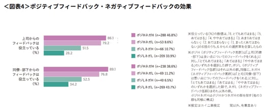 - ポジティブフィードバックの方が全体的に有効感が高いが、ネガティブフィードバックも有効であり、両方がそろっていると最も効果的(図表4)