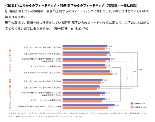 - 上司が「良い点についてのフィードバックをくれる」とした回答は、管理職が56.9%、一般社員が54.3%、同僚-部下が「良い点についてのフィードバックをくれる」とした回答は、管理職が50.8%、一般社員が49.2%で、「上司から」と「同僚-部下から」の間に有意差はなかった。