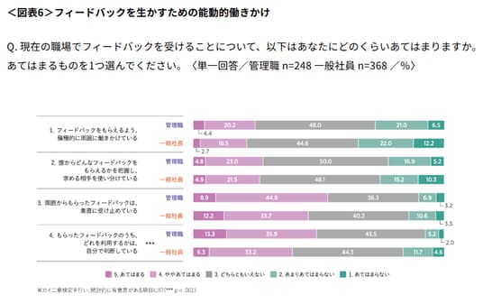 - 良いフィードバックを「受け取り」、自分の成長につなげるには、受け手の能動的な働きかけも必要となる。フィードバックを「求める」(図表6 項目 1.と2.)こと、「活用する」(図表6 項目3.と4.)ことについて尋ねたところ、「フィードバックをもらえるよう、積極的に周囲に働きかけている」と回答したのは約2割~2割半で、積極的にフィードバックを求める人は多いとはいえない。