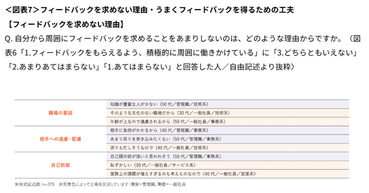 - フィードバックを積極的に求めない理由(図表7)としては、「職場の文化がそうでないから」などの職場の要因、「相手に負担がかかるから」などの遠慮・配慮、「課題が増えることを避けたい」といった自己防衛が挙げられた。