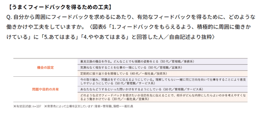 - 一方、フィードバックを求めている人は、「定期的に振り返り会を設ける」など機会の設定や、「目的を明示してフィードバックを求める」といった問題や目的の共有などの工夫を行っているようである。