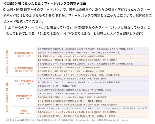 - 「同僚-部下からのフィードバック」は、管理職では「マネジメントに関するフィードバック」が多く、例えば、自分では気づかない点の指摘や、解決策の提案などが役立っているとされた。