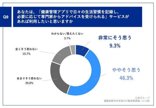 「Q9.あなたは、「健康管理アプリで日々の生活習慣を記録し、必要に応じて専門家からアドバイスを受けられる」サービスがあれば利用したいと思いますか。」(n=108)と質問したところ、「非常にそう思う」が9.3%、「ややそう思う」が46.3%という回答となりました。