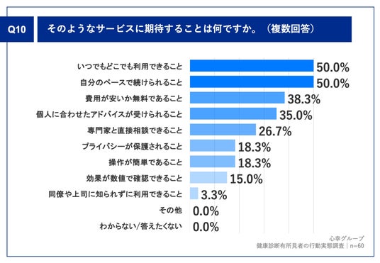 Q9で「非常にそう思う」「ややそう思う」と回答した方に、「Q10.そのようなサービスに期待することは何ですか。(複数回答)」(n=60)と質問したところ、「いつでもどこでも利用できること」が50.0%、「自分のペースで続けられること」が50.0%、「費用が安いか無料であること」が38.3%という回答となりました。