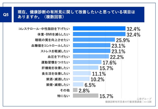 「Q5.現在、健康診断の有所見に関して改善したいと思っている項目はありますか。(複数回答)」(n=108)と質問したところ、「コレステロール・中性脂肪を下げたい」が32.4%、「体重・BMIを減らしたい」が32.4%、「睡眠の質を向上させたい」が25.9%という回答となりました。
