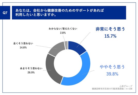 「Q7.あなたは、会社から健康改善のためのサポートがあれば利用したいと思いますか。」(n=108)と質問したところ、「非常にそう思う」が15.7%、「ややそう思う」が39.8%という回答となりました。