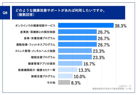 Q7で「非常にそう思う」「ややそう思う」と回答した方に、「Q8.どのような健康改善サポートがあれば利用したいですか。(複数回答)」(n=60)と質問したところ、「オンラインでの健康相談サービス」が38.3%、「産業医・保健師との個別相談」が26.7%、「食事・栄養指導プログラム」が26.7%という回答となりました。