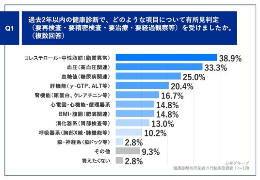 「Q1.過去2年以内の健康診断で、どのような項目について有所見判定(要再検査・要精密検査・要治療・要経過観察等)を受けましたか。(複数回答)」(n=108)と質問したところ、「コレステロール・中性脂肪(脂質異常)」が38.9%、「血圧(高血圧関連)」が33.3%、「血糖値(糖尿病関連)」が25.0%という回答となりました。